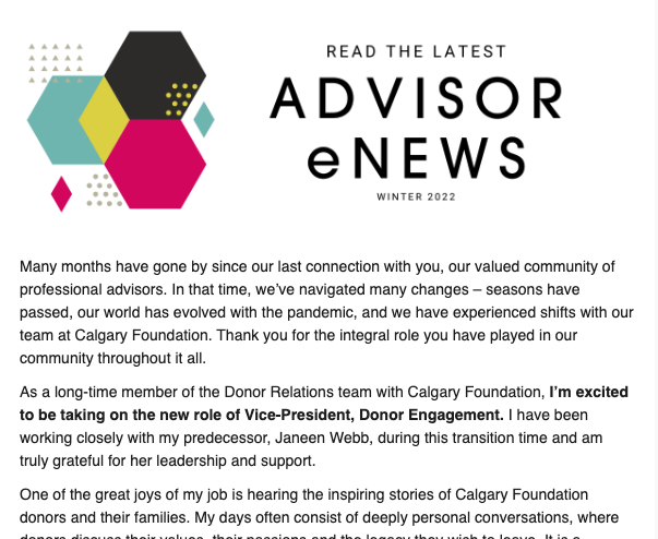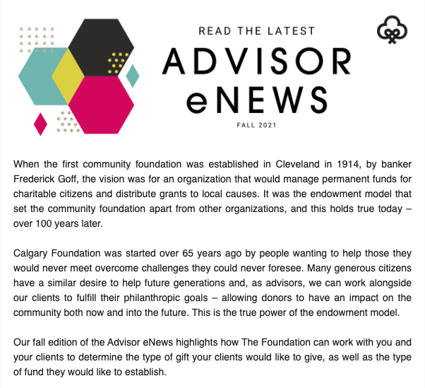 The Advice to Advisors Newsletter provides timely information on philanthropy and charitable giving.